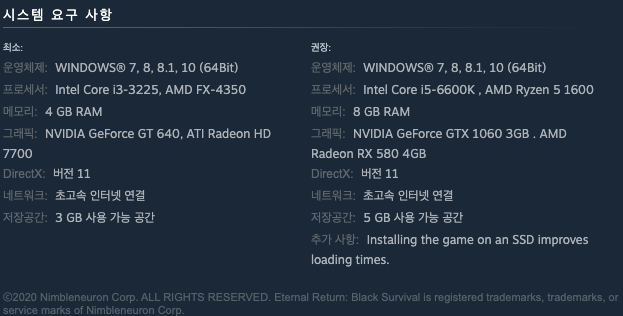 스팀에서 발표한 시스템 요구 사항이다. 요즘 시대에 사양도 낮은편이며 게임이 가벼워서 용량이 그렇게 큰편이 아니라 PC방에서도 언제든지 원한다면 금방 설치하여 플레이 가능한정도이다.