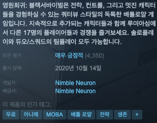 서바이벌 온라인게임 블랙서바이벌: 영원회귀가 스팀에서 2020년 10월 14일에 무료로 출시 되었다. 글의 제목을 왜 저렇게 했는지는 게임을 플레이해보면 바로 알 수 있을것이다. 말 그대로 리그 오브 레전드와 배틀그라운드의 장점만을 가져와서 잘 섞어 만든 게임이라고 볼 수 있다. 왜 그런지는 차근차근 설명해 드리도록 하겠다.