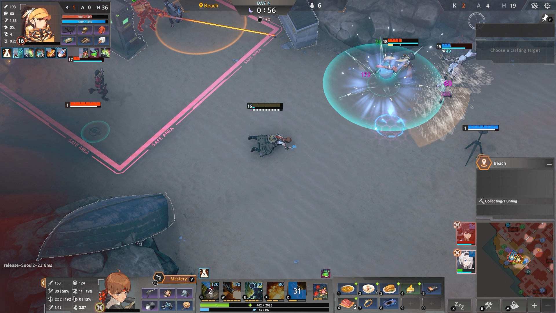또 배틀그라운드가 생각나는 부분이 있었는데 바로 듀오나 스쿼드시 캐릭터가 사망하게 되면 그로기 상태가 되어 기어다니게 되고 같은 팀원만이 시간을 소모하여 캐릭터 소생이 가능하다는 점이다. 또 일정시간이 지나면 랜덤으로 보급상자가 배달이 되고 보급상자를 파밍하게 되면 완성된 상급장비를 바로 획득할 수 있고, 다른 플레이어를 처치해 장착중인 장비를 파밍을 할 수도 있으며 섬의 보스인 위클라인 보스가 등장하여 처치하면 장비제작에 중요한 아이템을 얻을수도 있다.