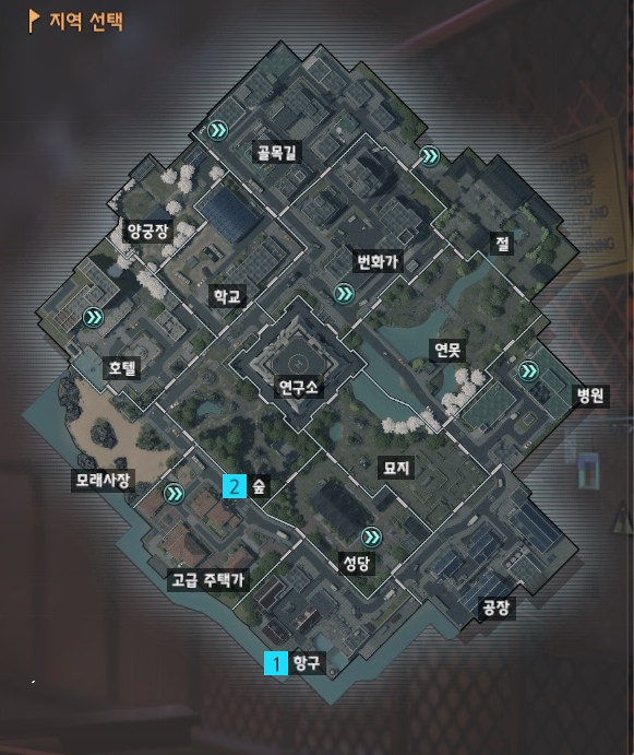게임을 시작하게 되면 각 캐릭터마다 추천 되어있는 아이템 또는 플레이어가 직접 지정한 아이템에 대해서 루트추천이 맵에 표시되며 맵 중앙인 연구소를 제외한 15가지의 지역에서 스타팅을 할 수 있도록 선택이 가능하다.