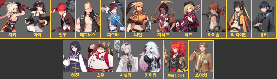 캐릭터는 현재 17캐릭터가 있으며 각 캐릭터마다 사용하는 무기와 컨셉이 다르다. 캐릭터는 기본으로 주어지는 캐릭터가 있고 게임플레이를 통해 포인트를 모아서 구입할 수 있으며 물론 과금을 통해서 구입하는 방식도 있다. 아직까지 오픈 초기라 스킨은 없지만 스킨도 나올 예정일 것이며 공지사항에는 꾸준히 캐릭터를 추가하려는 모습을 보이고 있다.